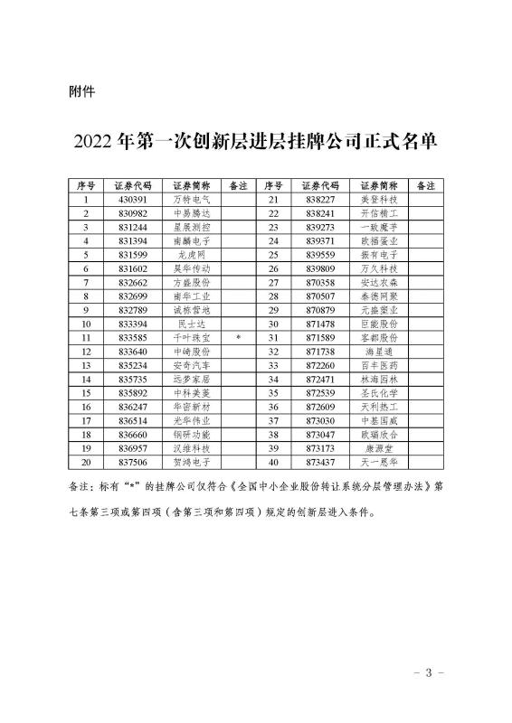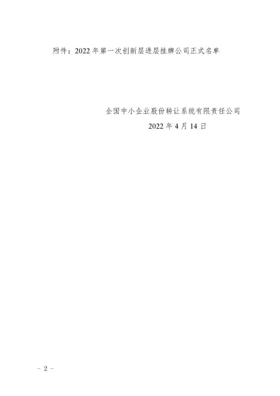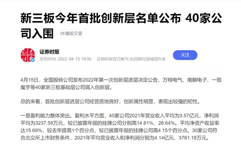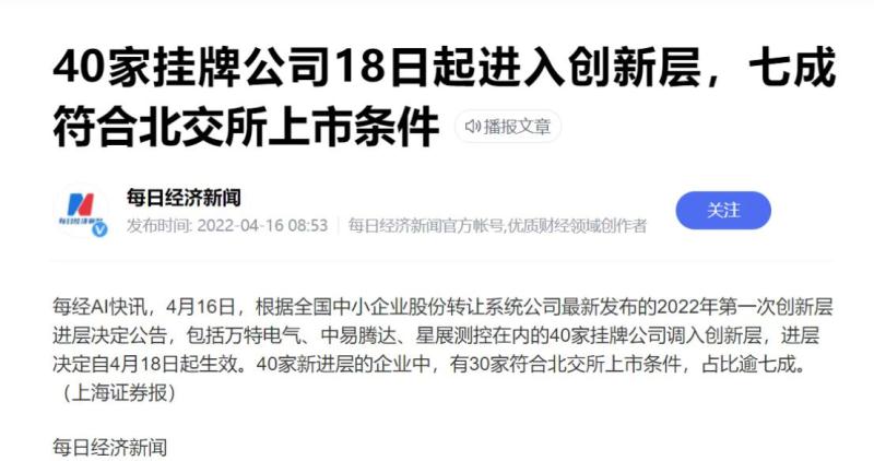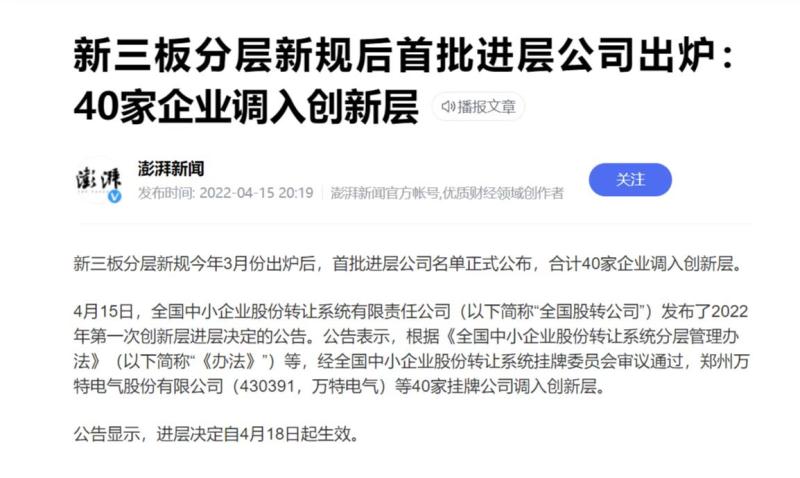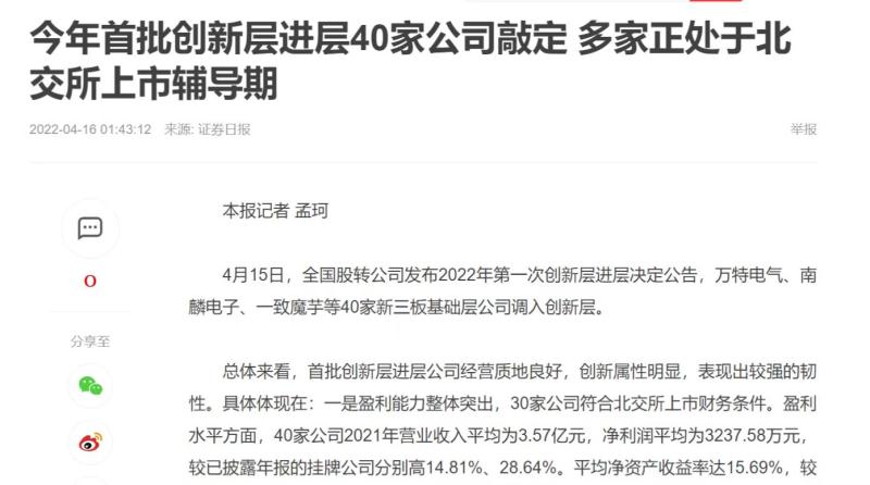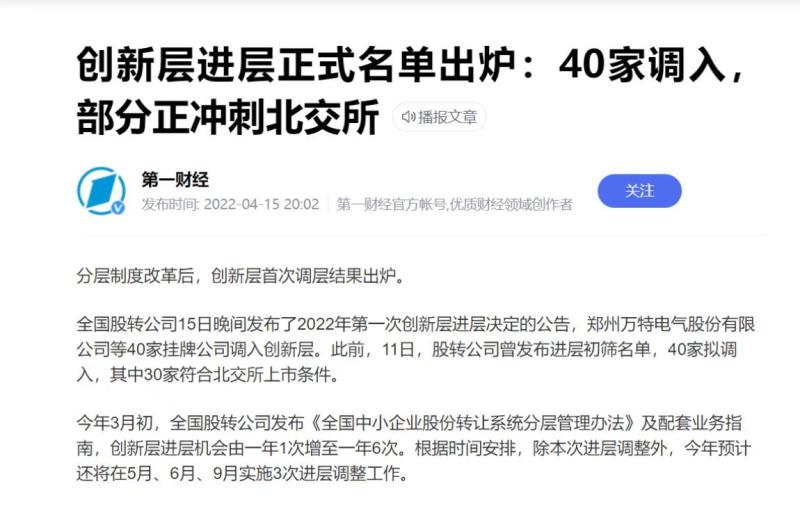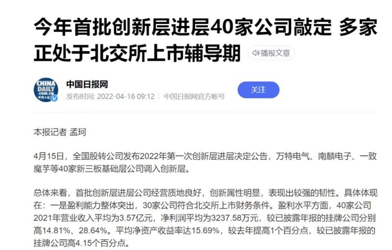 該消息來自于全國股轉(zhuǎn)公司于 2022 年 4 月 15 日發(fā)布的“2022年第一次創(chuàng)新層進層決定的公告”,這是新三板分層改革后首個進層名單。