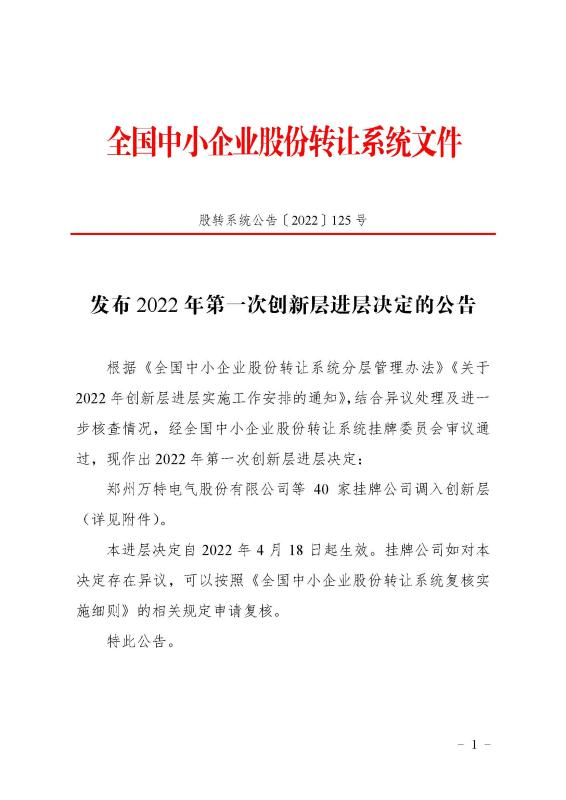 萬特電氣2022年4月18日調(diào)入創(chuàng)新層
